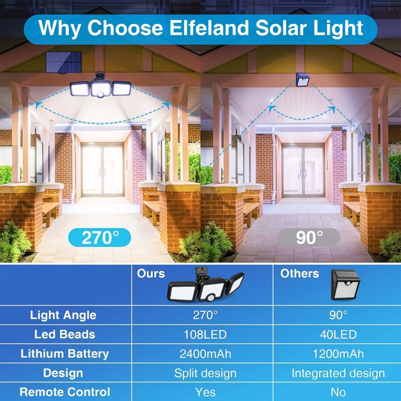 There are two ways to control the solar security lights: either by pressing the button on the back or using the remote control from up to 16 feet away. You can effortlessly toggle between four different lighting modes. With 108 LEDs and a 270° wider illumination range, it provides ample brightness and can be adjusted to any angle as needed.