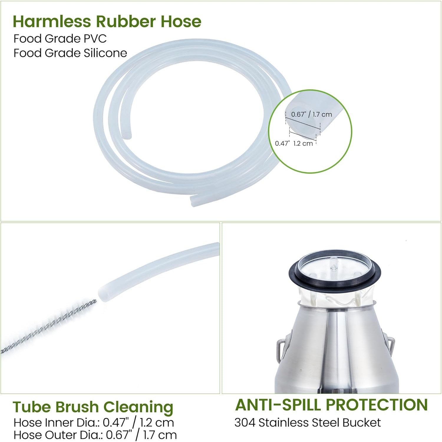 Hygienic Milk Handling & Storage: Designed with a 25L food-grade 304 stainless steel bucket and 8.2ft food-safe silicone tubing, this system preserves milk freshness by preventing oxidation and bacterial contamination. The closed-loop architecture ensures raw milk integrity, making it ideal for dairy farmers prioritizing hygiene and regulatory compliance.