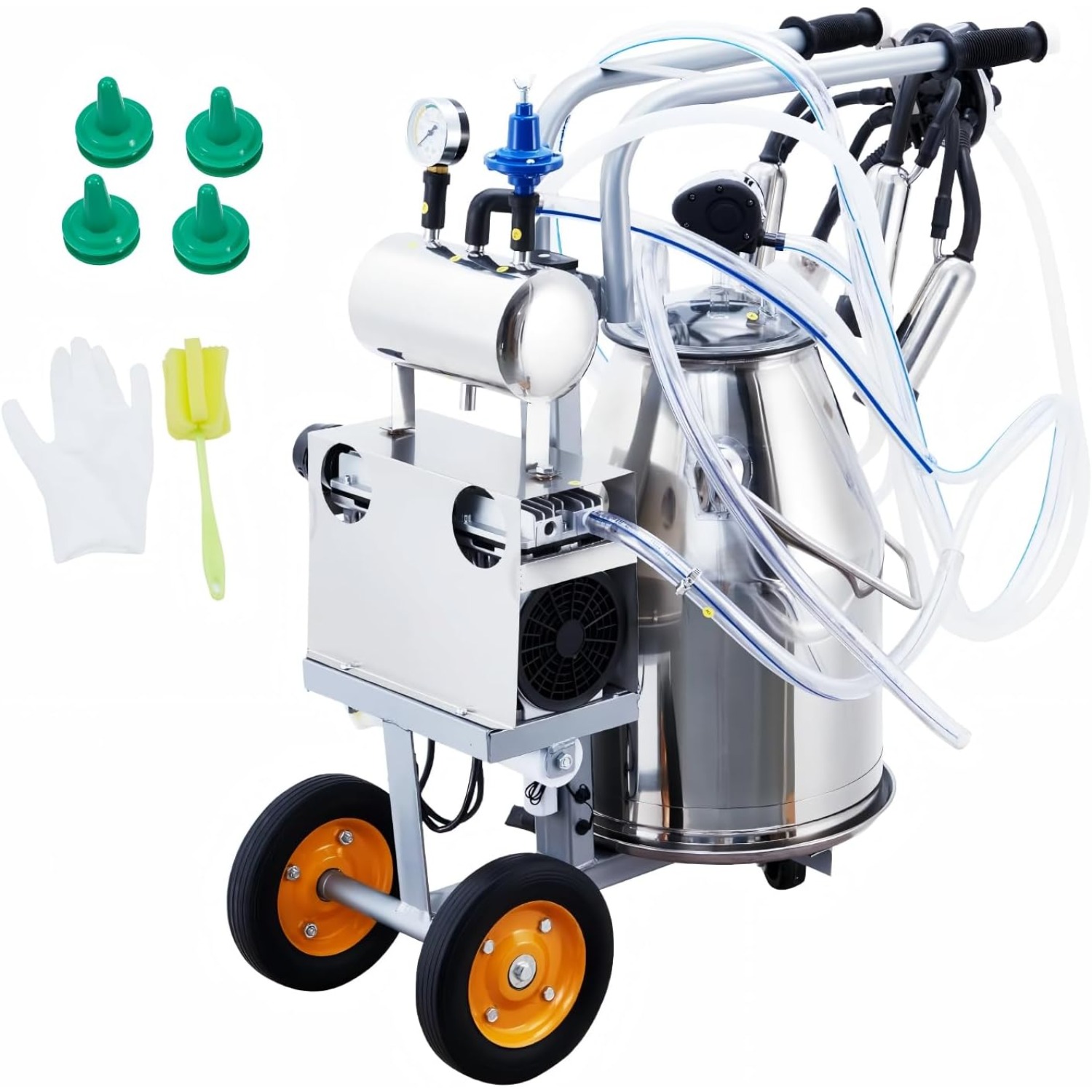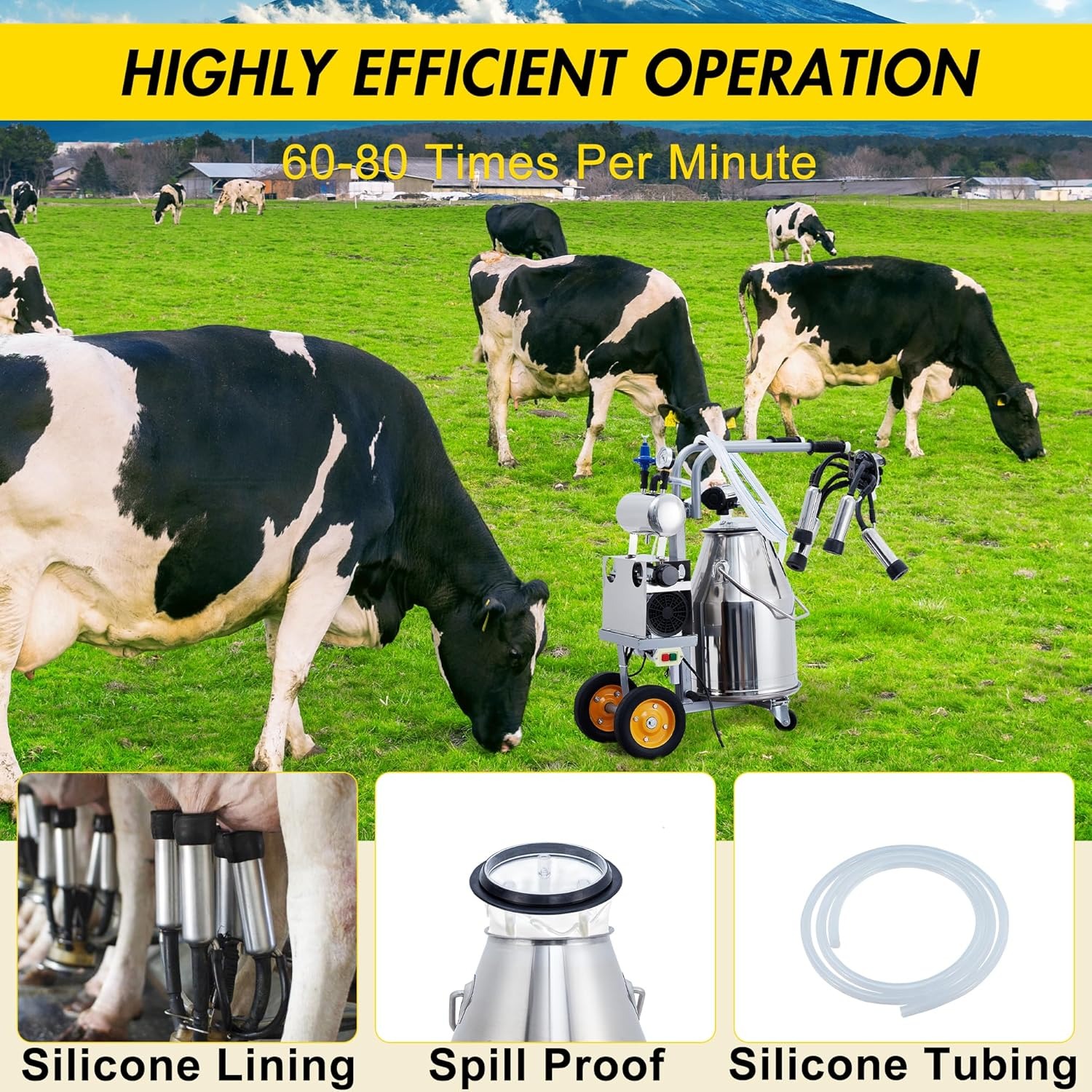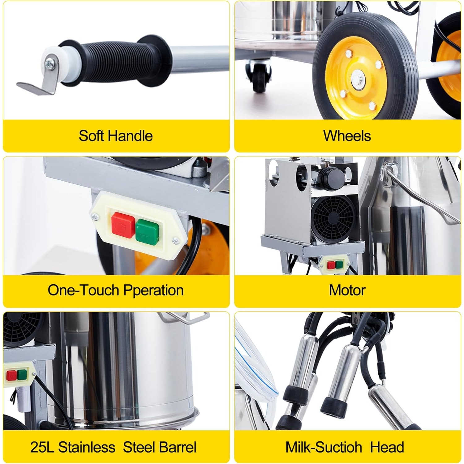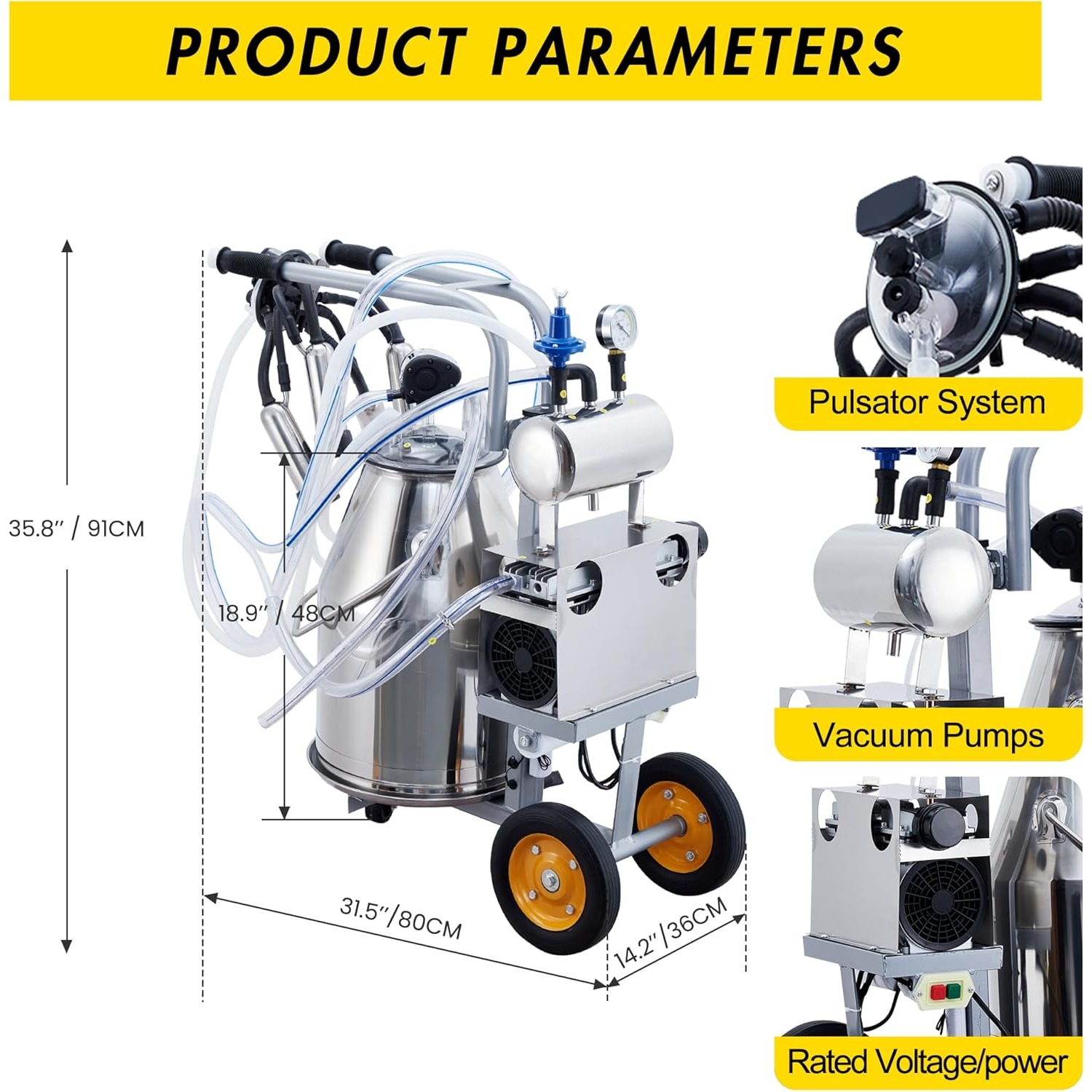 Product descriptionElectric Cow Milking MachinePRODUCT SIZE:35.8*31.5*14.2 InchMaterial: 304 Stainless Steel, Food-grade SiliconeCapacity: 6.6 Gal/25LPower: 550W, 120V/60HzPulsator System:60-80 times per minuteVacuum Pumps:55KPA 1500 rpmRated voltage/power: AC 120V/60HZWell-equipped with accessories