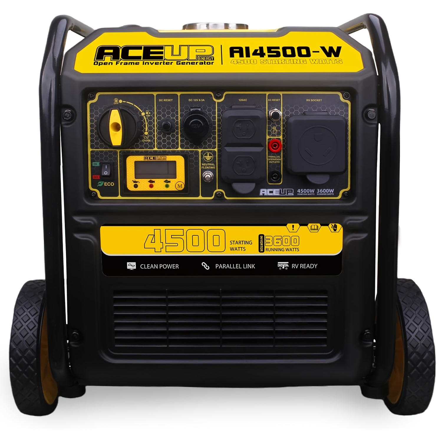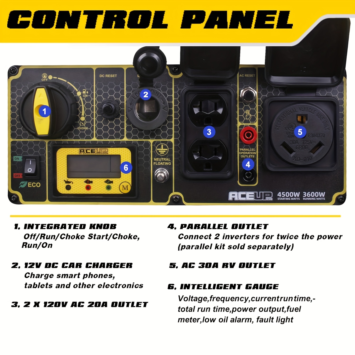 223cc 4-stroke OHV engine produs 4500 peak watts and 3600 rated watts with recoil start for up to 10 hours at quarter-load on 2.65 gallon, hertz 60HzIntelligent gauge keeps track of voltage, run-time and hertz, plus feature low oil LED and economic mode to save fuel