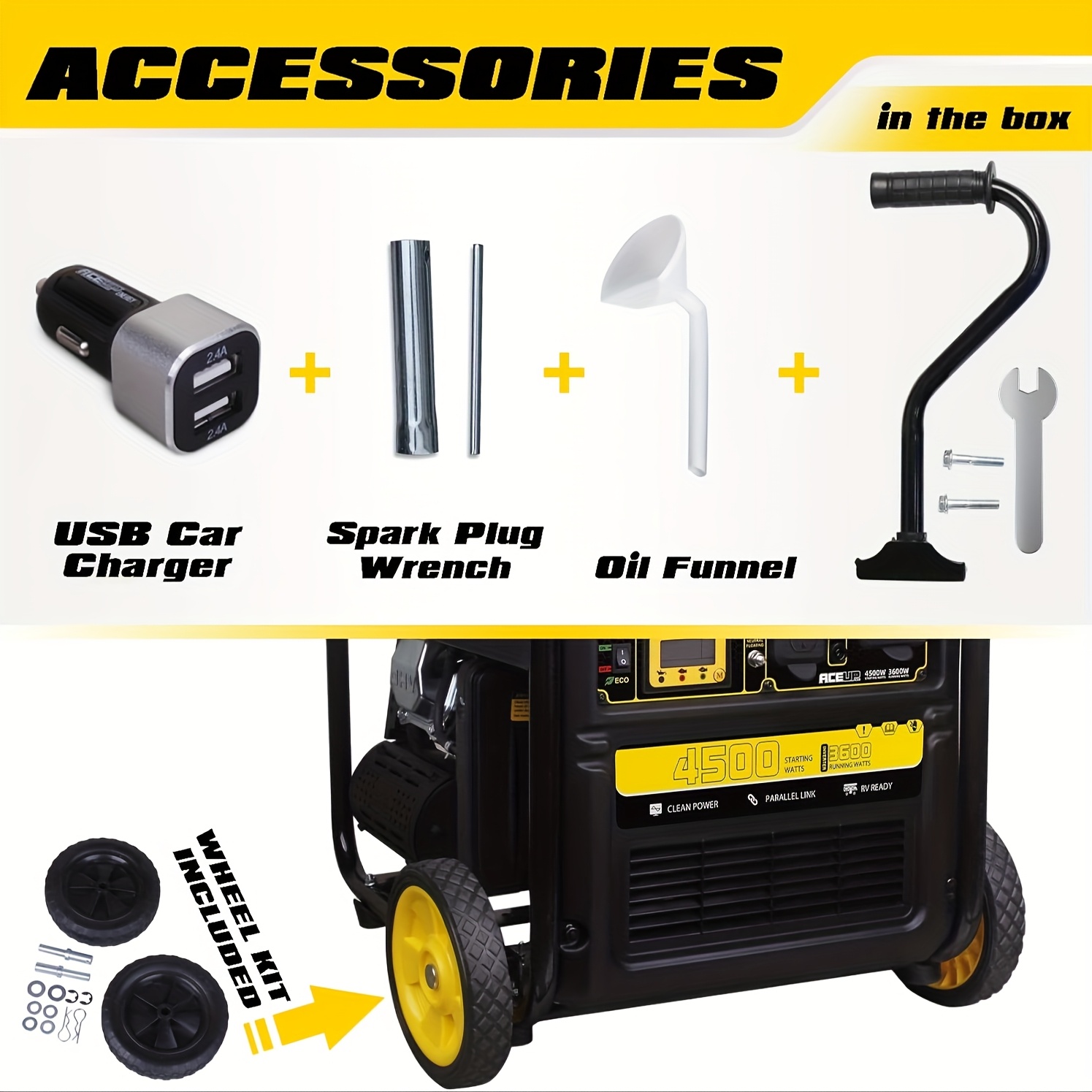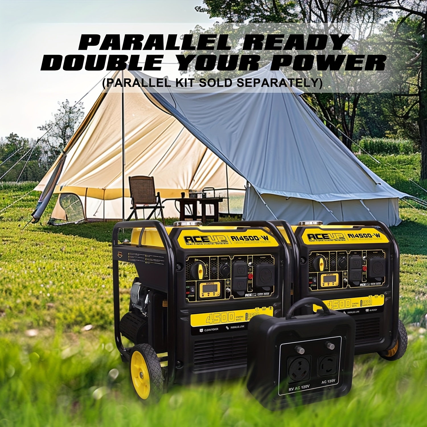 Includes 120V AC two 20A outlets and one 30A RV, one 12V DC 8.3A outlet, one car charger adapter (two 5V USB ports); Parallel ready to connect 2 generators for twi the power (paralletl kit sold separately)This Inverter generator for camping produs the clean power required by a variety of sensitive electronics such as phones, TV