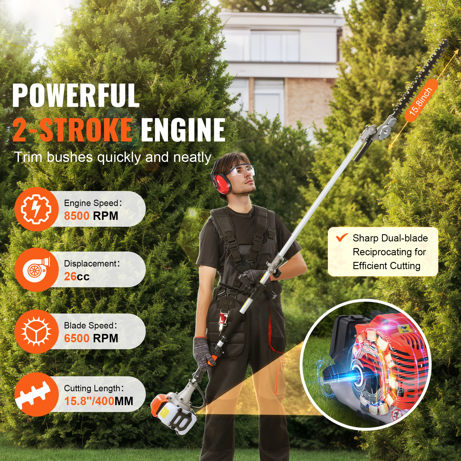 Efficient Trimming: Equipped with a 26CC 2-stroke engine and 8500rpm speed, the gas hedge trimmer offers powerful performance. The 6500rpm blade speed ensures sharp, efficient trimming of branches, shrubs, tea gardens, and green belts.
