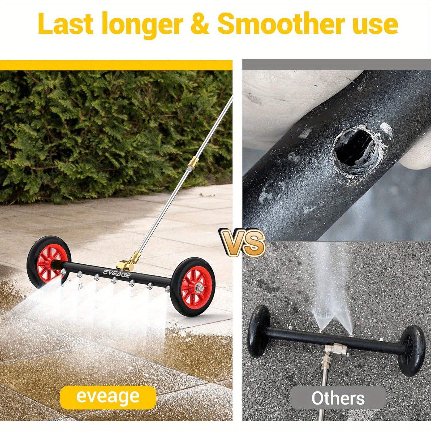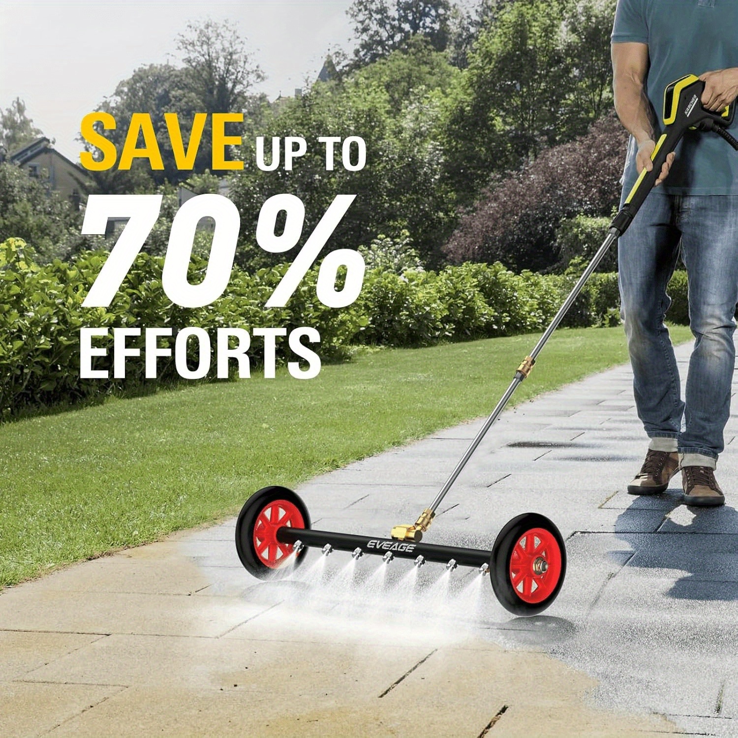 Our pressure washer water broom is equipped with a 24-inch width and 7 nozzles, significantly broader cleaning path compared to a traditional single nozzle. Achieving twice the cleaning results with half the effort.