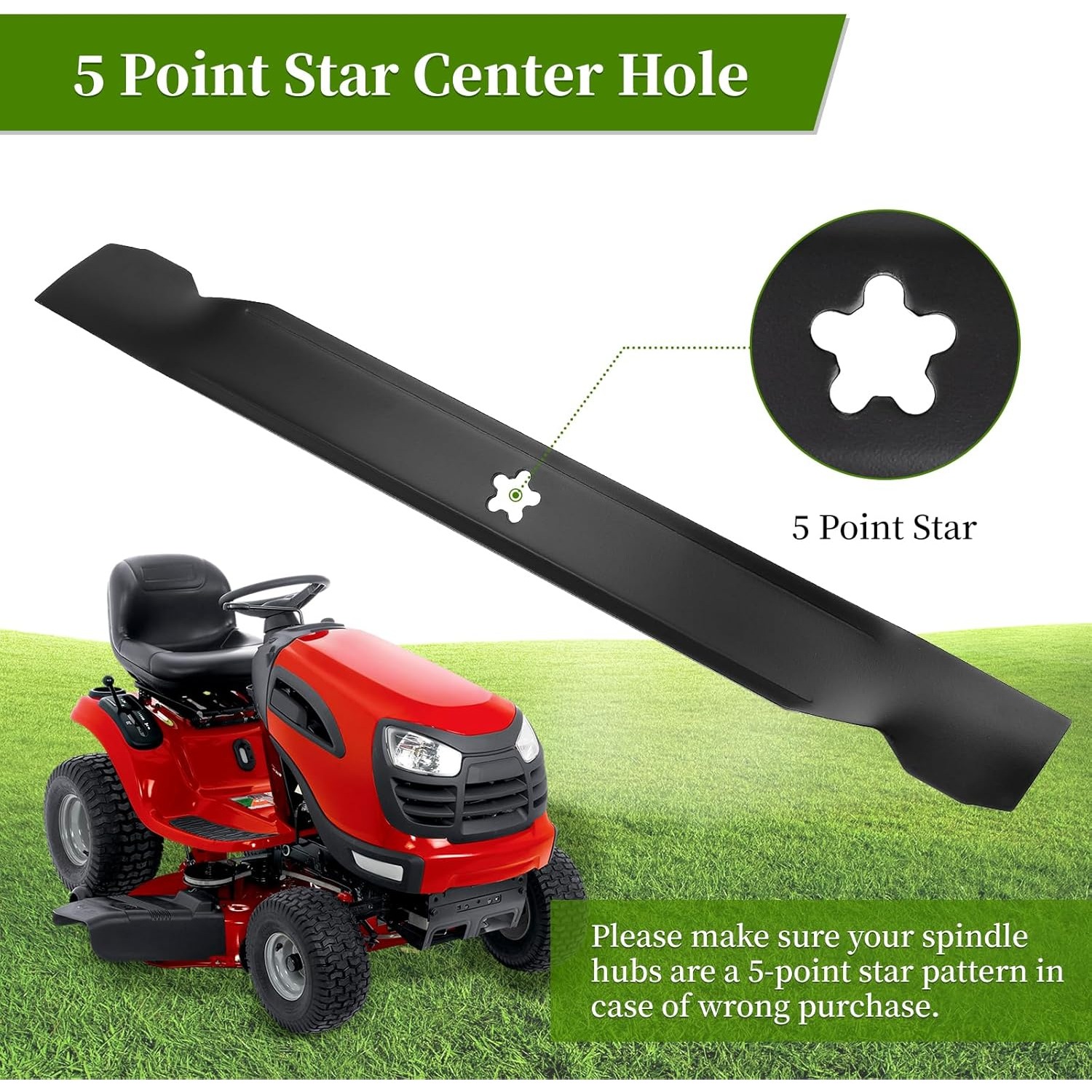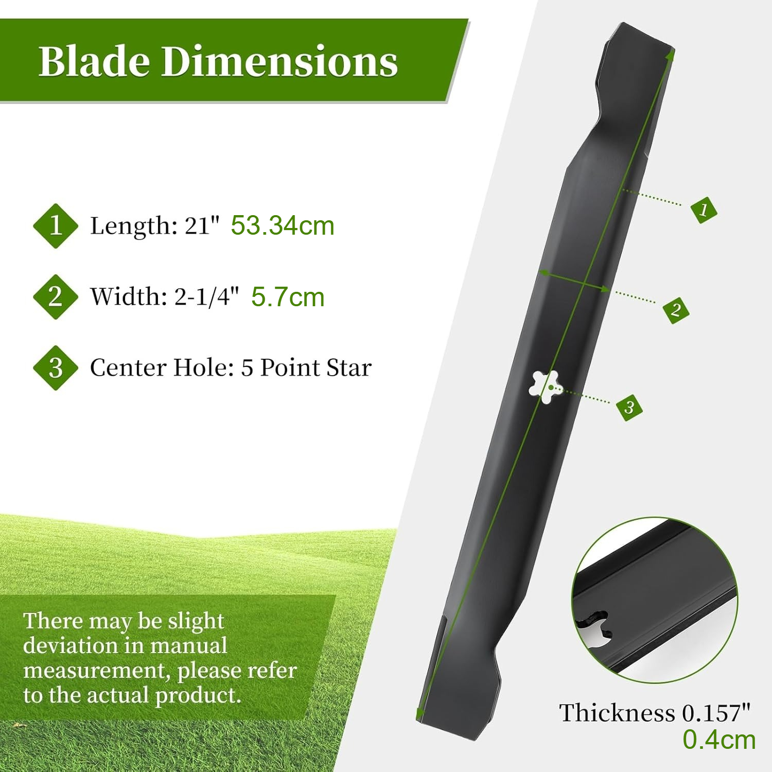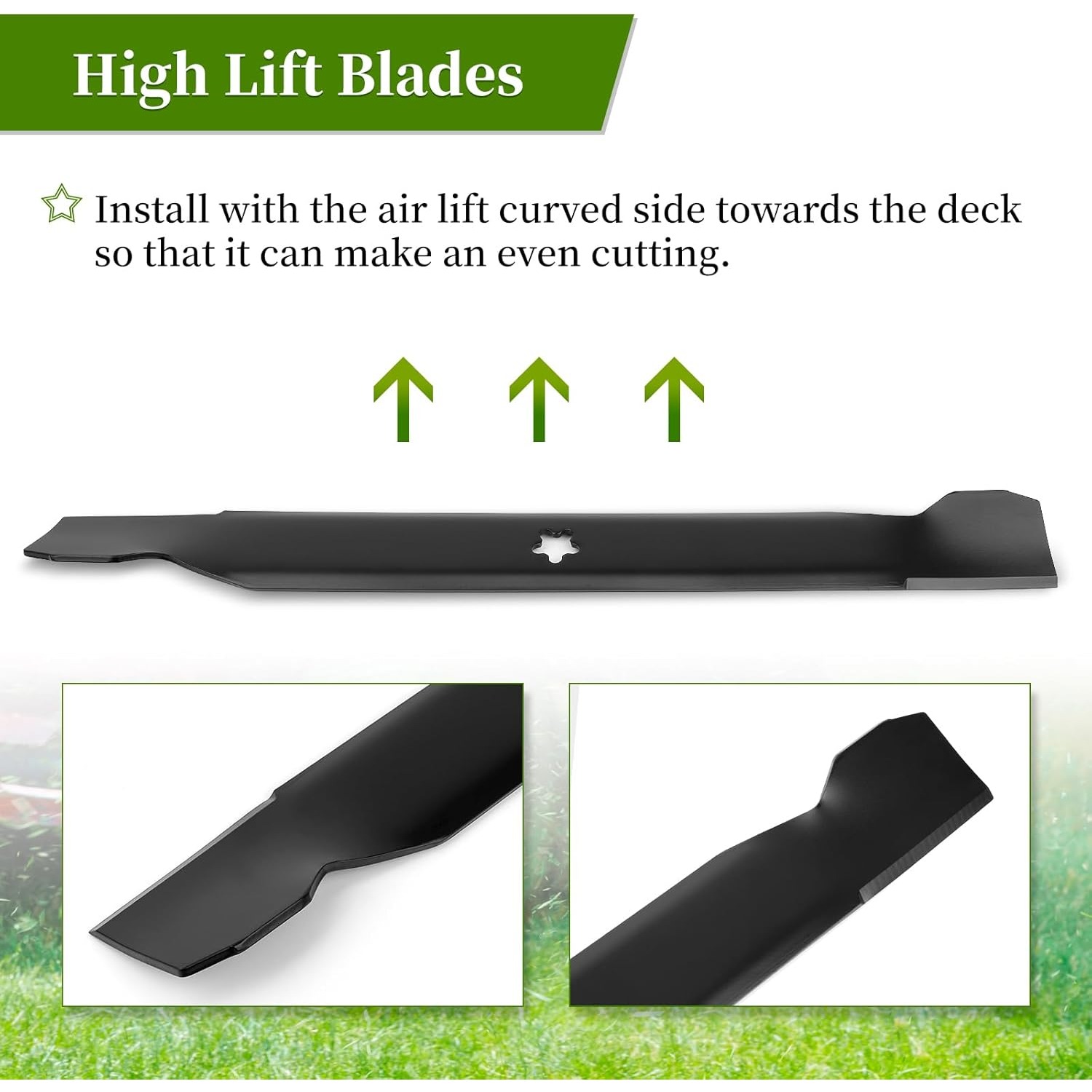 【Simple Setup】Pre-drilled holes in a 5-point star pattern with a protective edge coating. Change out old blades in three steps: ① First, disconnect the fuel valve and spark plug ② Position the bolts with the designated fixing points on the deck. Ensure the curved ends are directed towards the mower deck for optimal cutting flow ③ Check the rotation before starting.