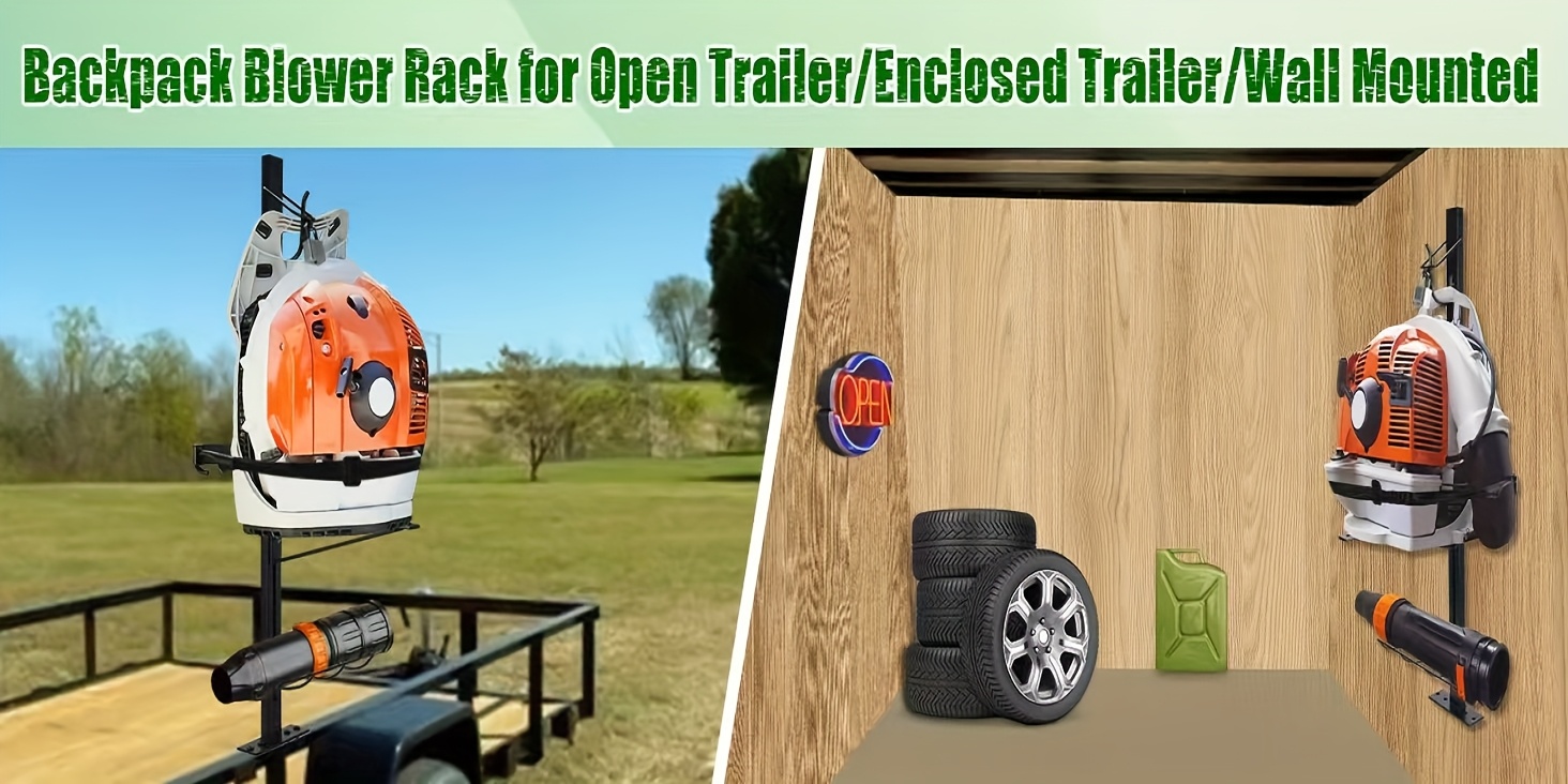 The backpack blower rack for trailers is compatible with blowers ranging from 16 to 25 inches that have a top handle. It provides various mounting options and can be easily installed in both open and enclosed trailers or garages, making storage and transport simple!