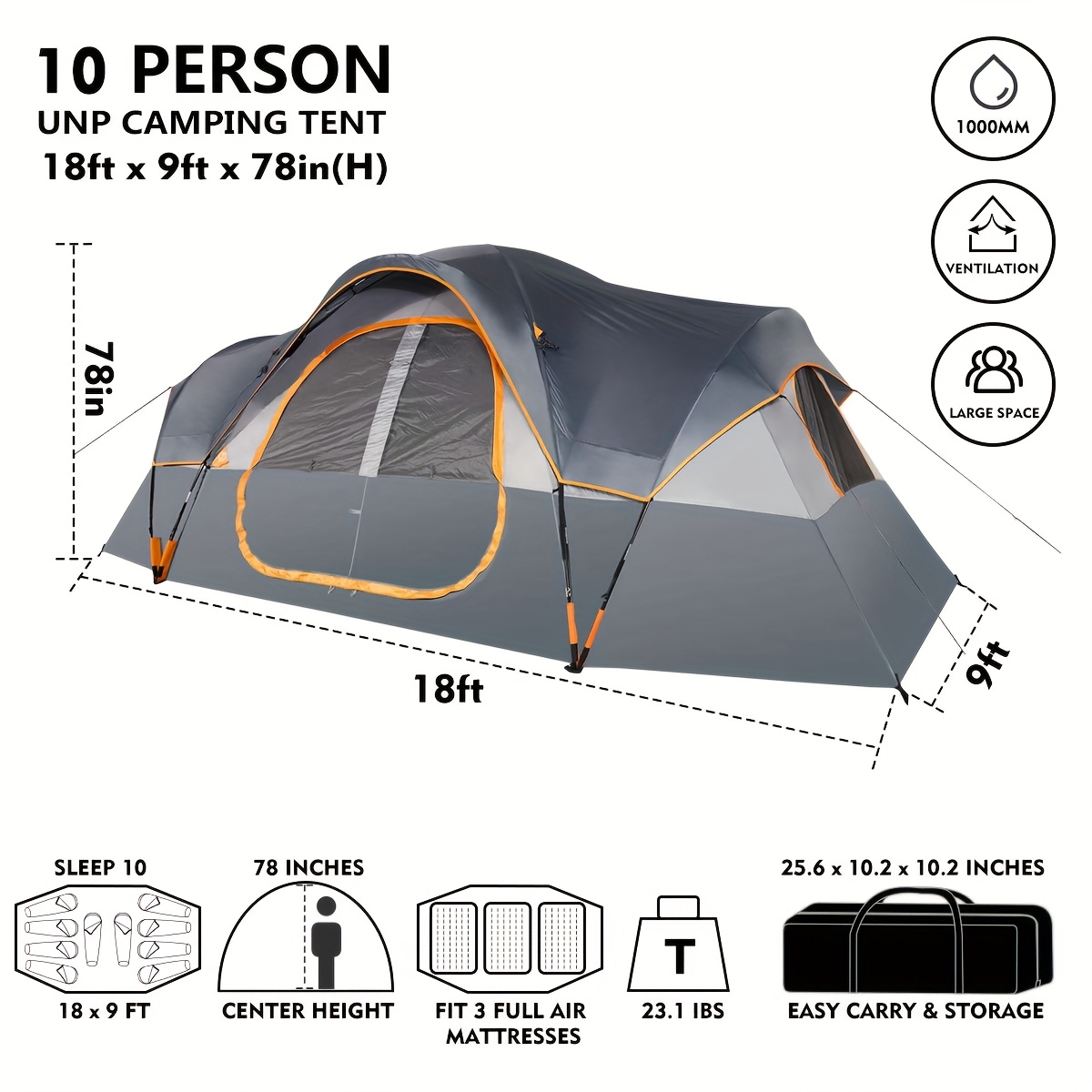 Gather everyone and enjoy plenty of space! This roomy tent for 10 people (18ft x 9ft x 78in) can accommodate 3 queen-sized air mattresses or up to 10 sleeping bags—ideal for family gatherings, group excursions, or outdoor weekends.
