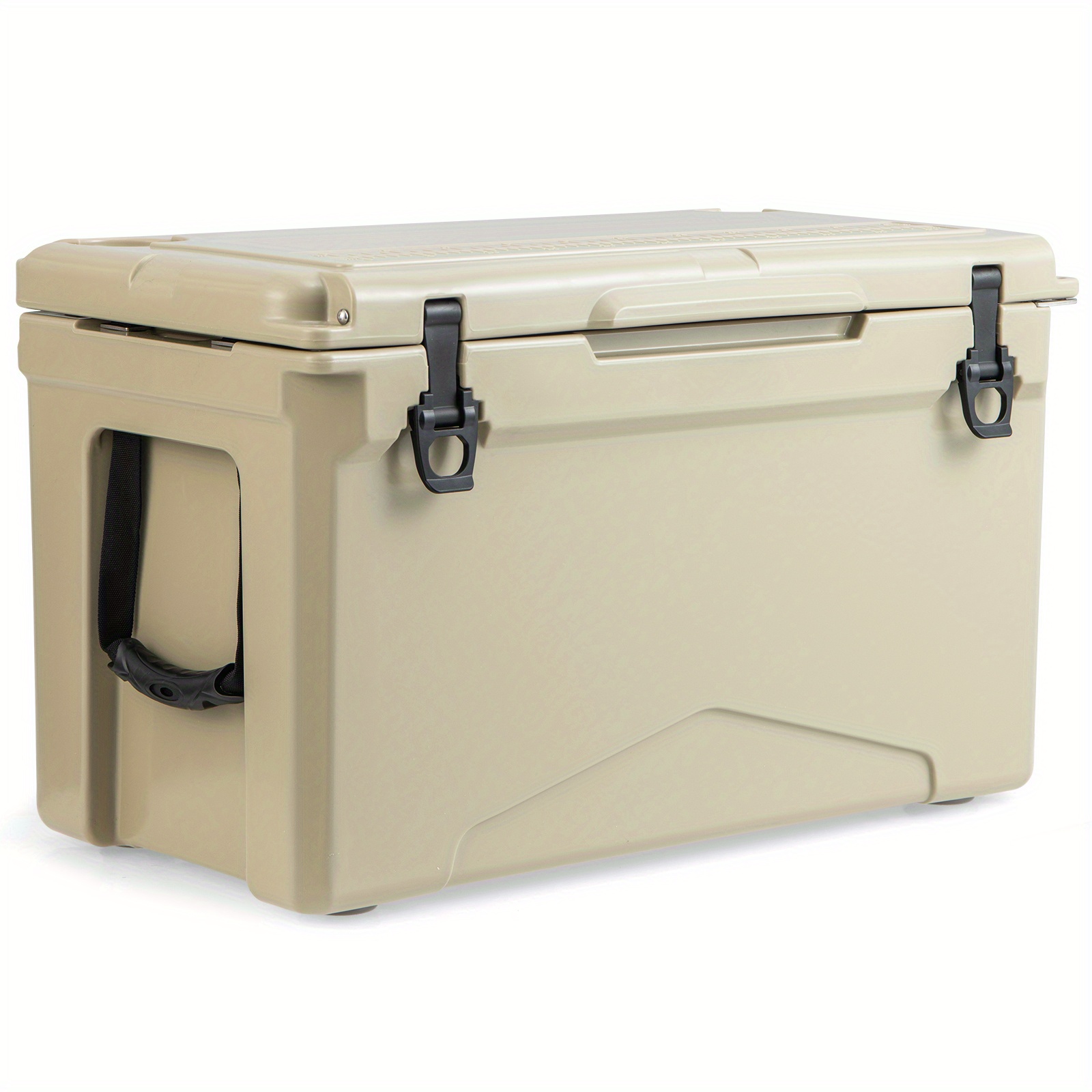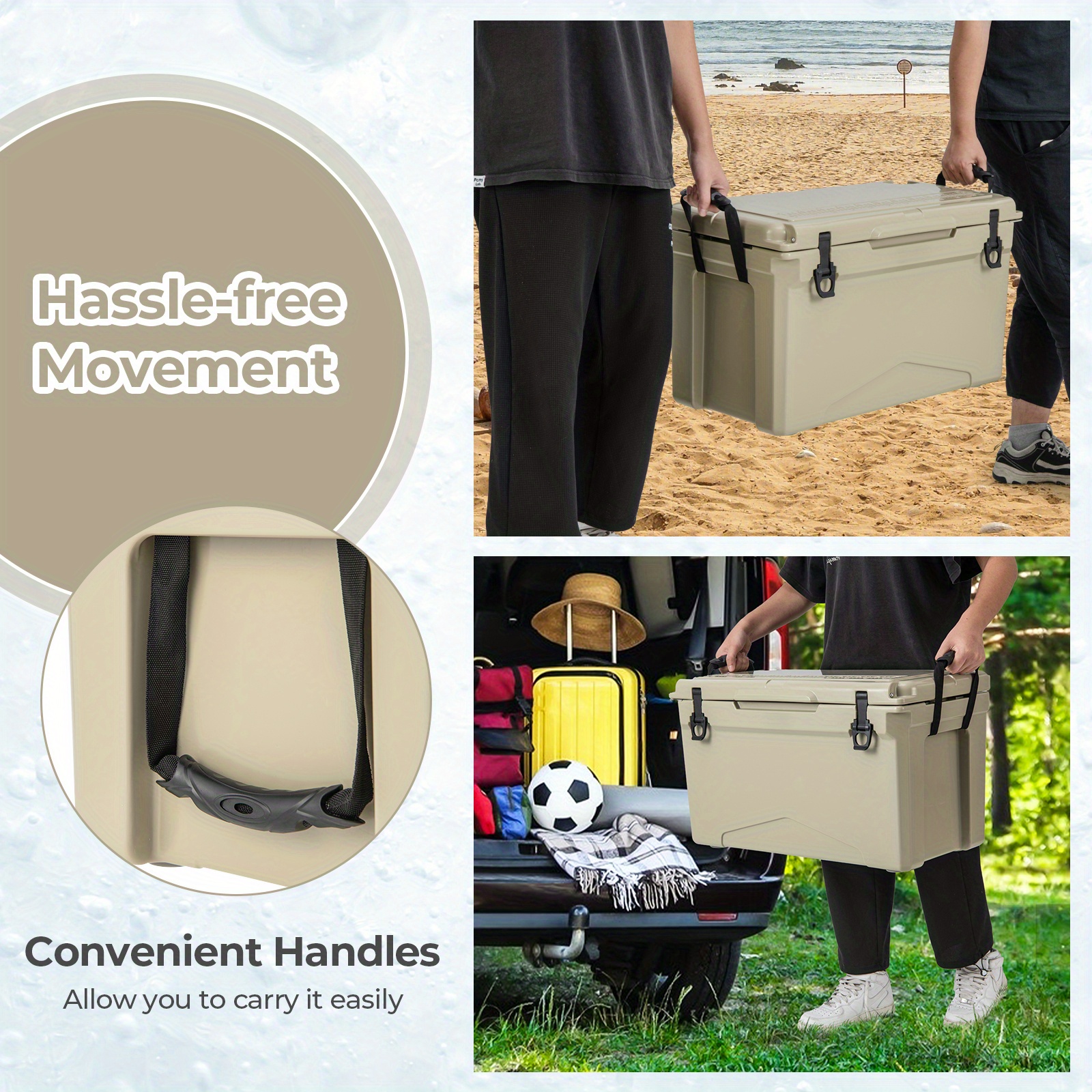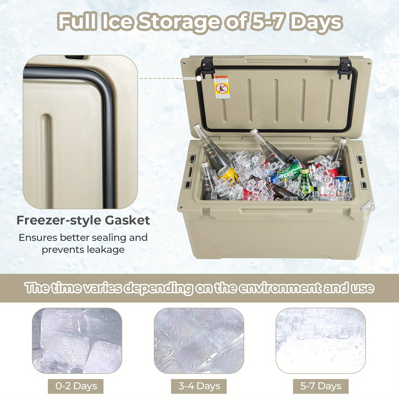 Enjoy easy access to tasty meals using our 50-quart rotomolded cooler! This outdoor hard cooler, made with high-quality materials and a rotomolded design, can keep items cold for 5-7 days, unlike the typical 0-2 days or 3-4 days. (Duration may vary based on conditions and usage.) It can also preserve freshness or maintain warmth to suit your different requirements. Additionally, it features a built-in bottle opener, cup holders, and a fish ruler for added convenience outdoors. The sturdy nylon handles make it easier to transport this insulated ice chest. When you need a break, simply sit down and relax. With its spacious capacity, this durable hard cooler is perfect for various outdoor activities such as camping, picnicking, road trips, fishing, and more.
