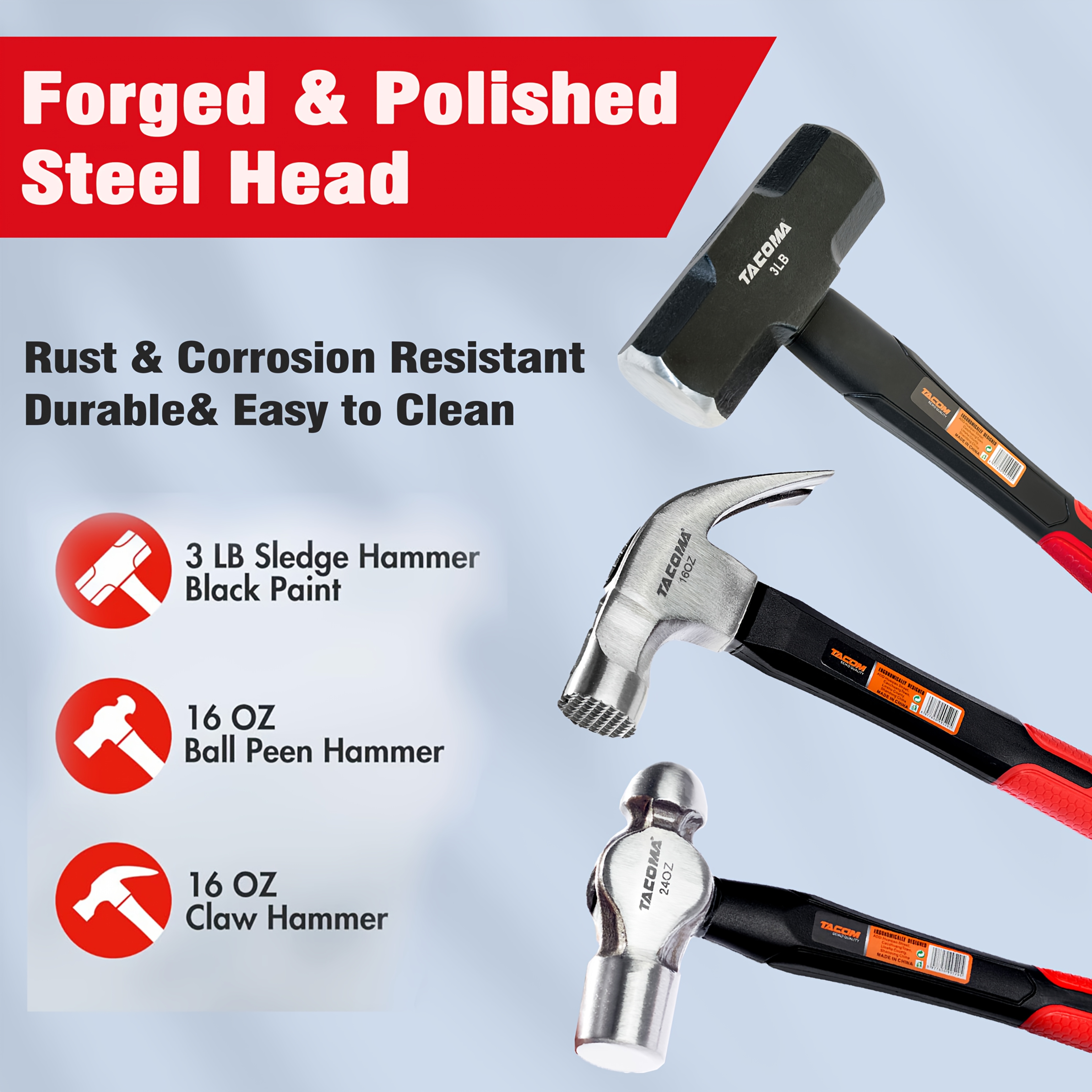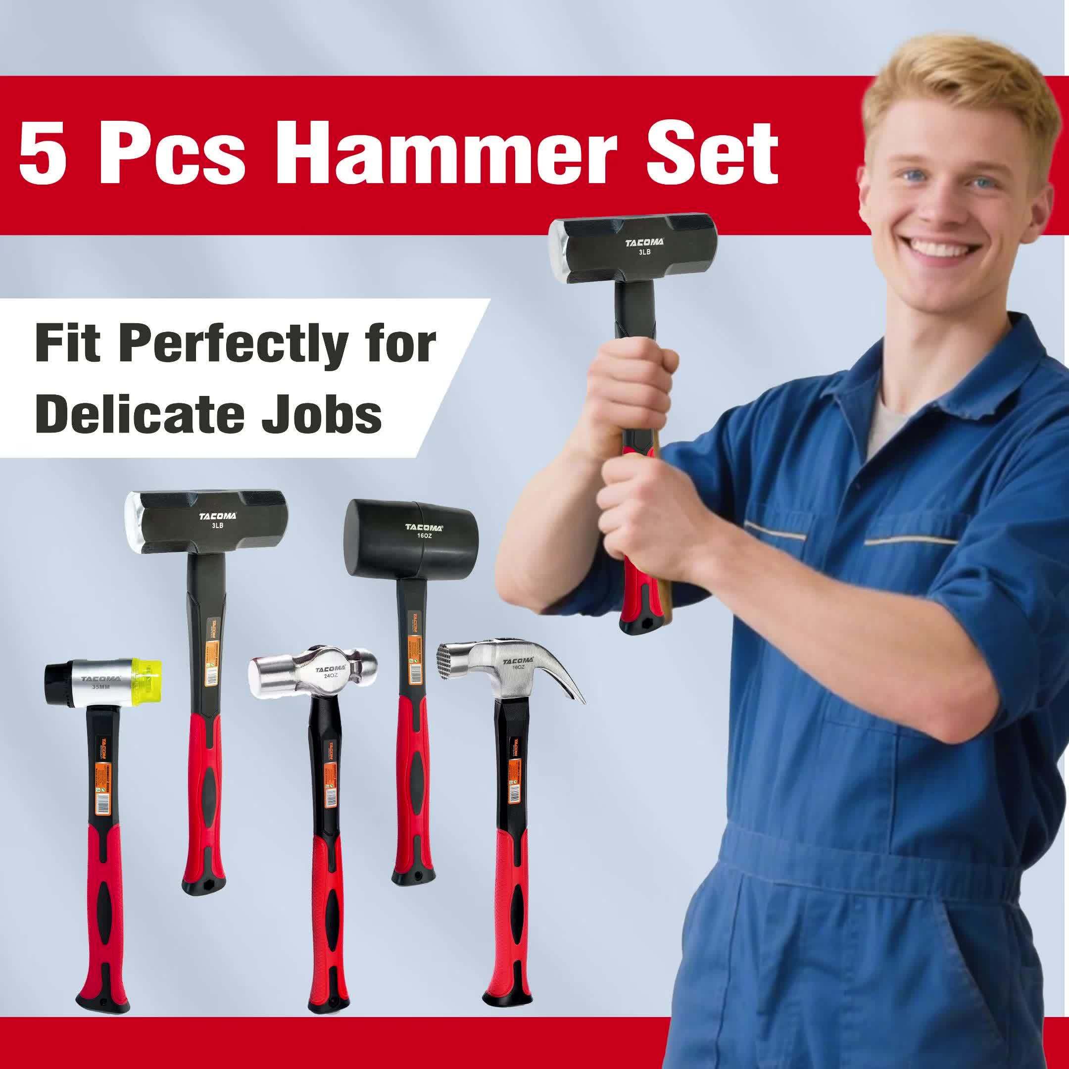 TACOMA offers a 5-piece hammer collection that features a 3-pound sledgehammer with black paint, a 24-ounce ball peen hammer, a 16-ounce claw hammer, a 16-ounce rubber mallet, and a 35mm installation hammer. Each hammer is designed for specific tasks, enhancing your efficiency in delicate work.