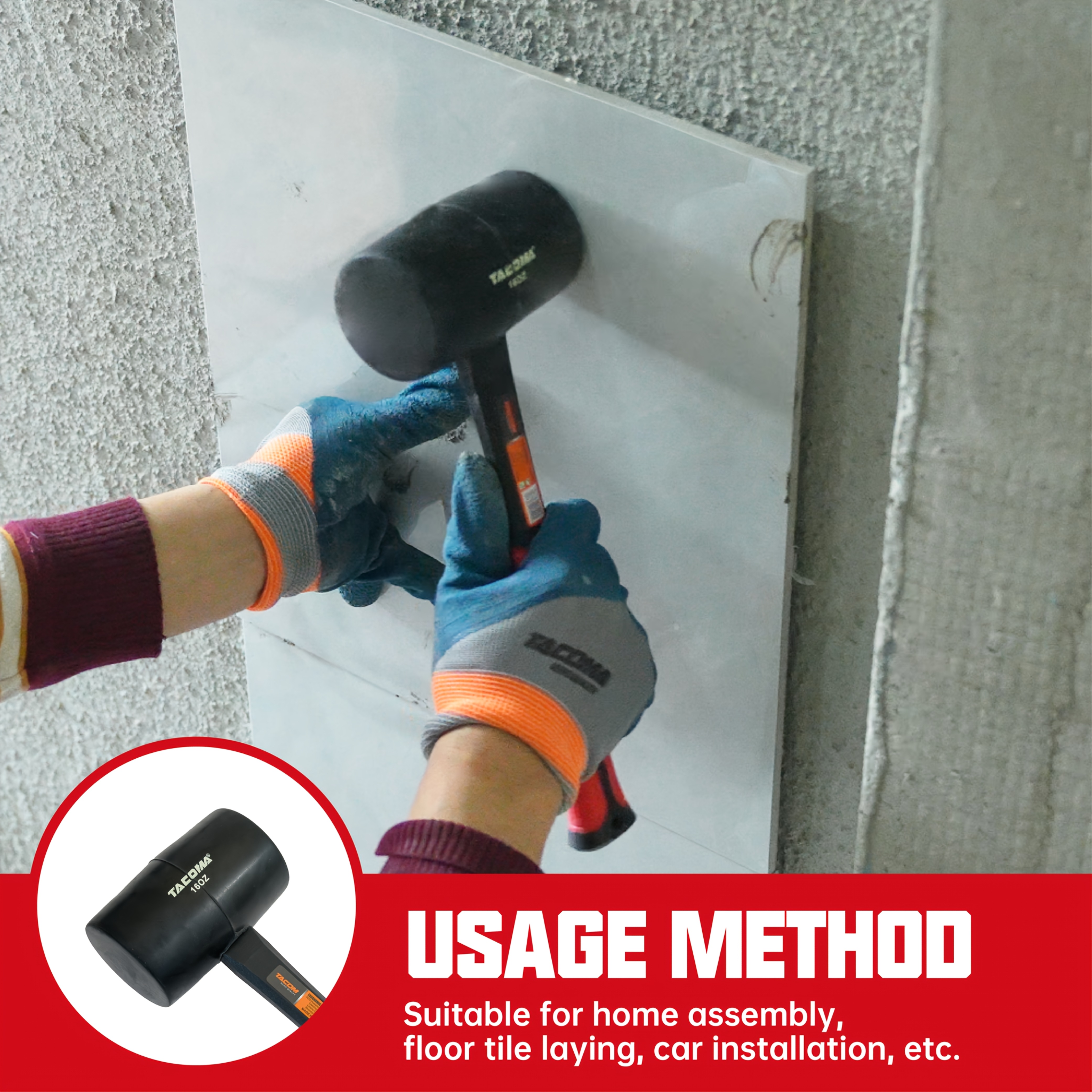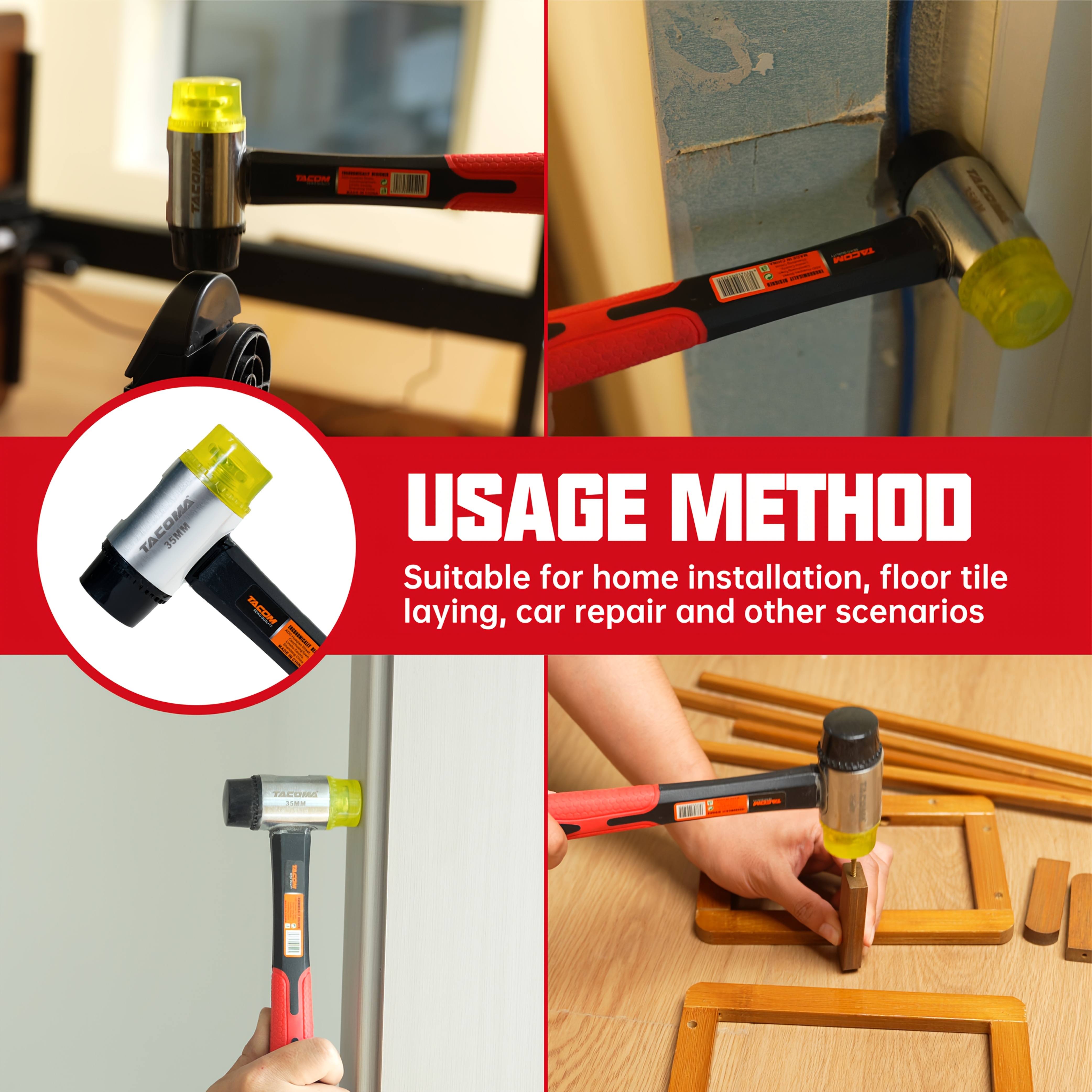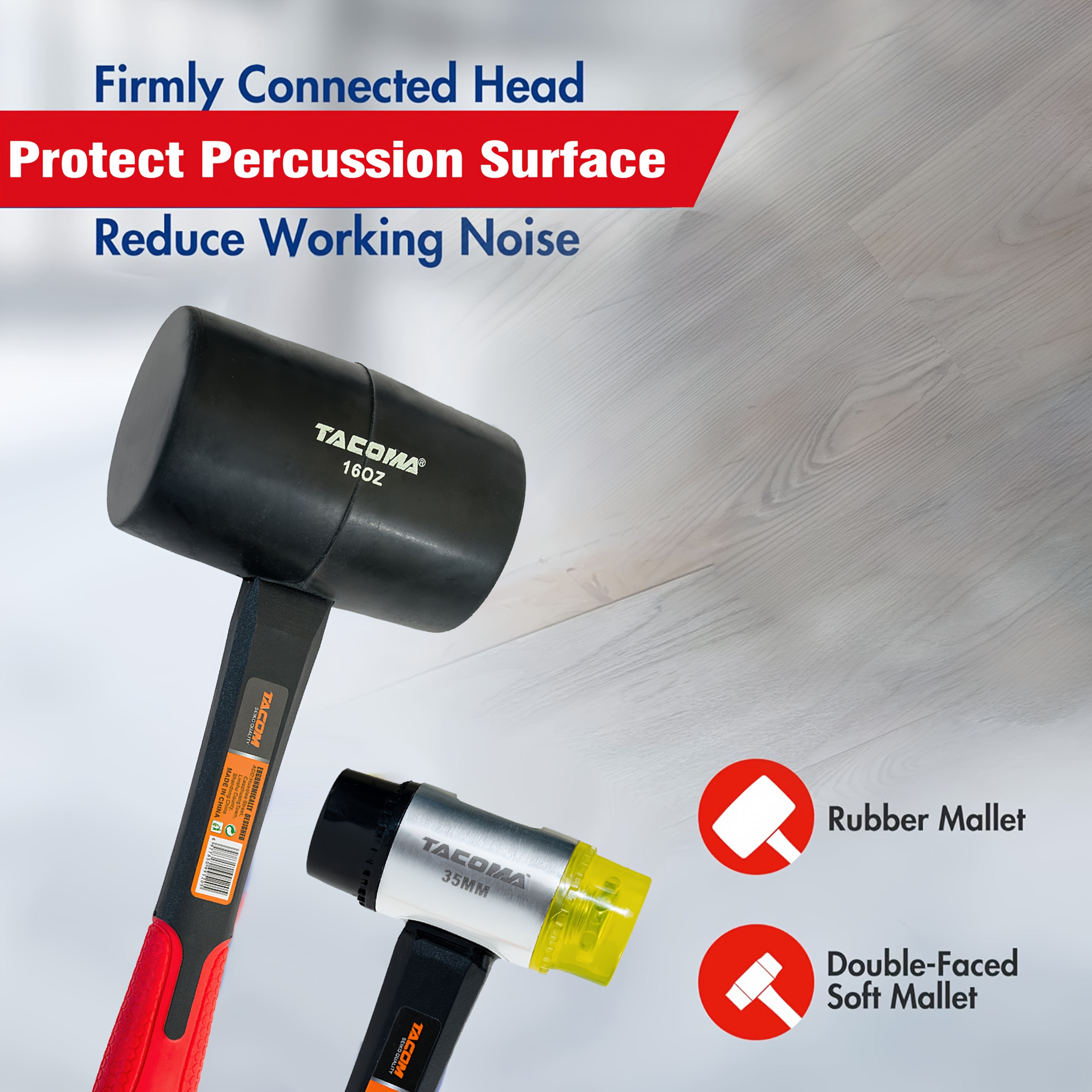 The rubber mallet and the soft mallet with dual faces are ideal for tasks like woodworking, leather crafting, and floor installation, as they help safeguard surfaces from damage and minimize noise during work. The soft hammer features two detachable faces for convenient head swapping, and its dual embedded design ensures that the hammer head stays securely in place.