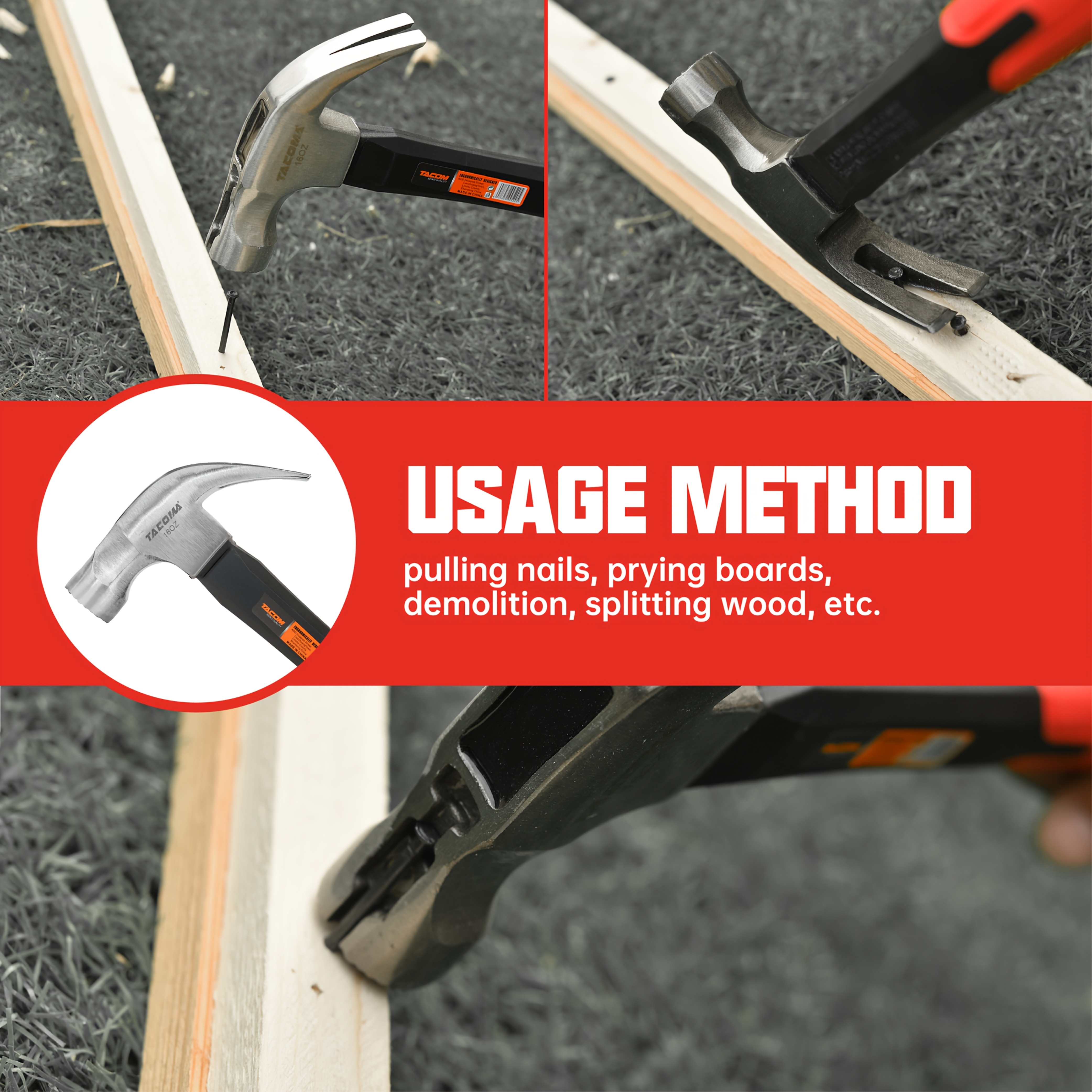 The heads of the claw hammer, ball peen hammer, and sledge hammer are crafted from premium steel, ensuring durability, corrosion resistance, and ease of cleaning. The claw hammer is designed for removing nails, while the rounded end of the ball peen hammer is ideal for shaping metal sheets and striking chisels and rivets. Additionally, the sledge hammer features a black coating that improves rust protection.