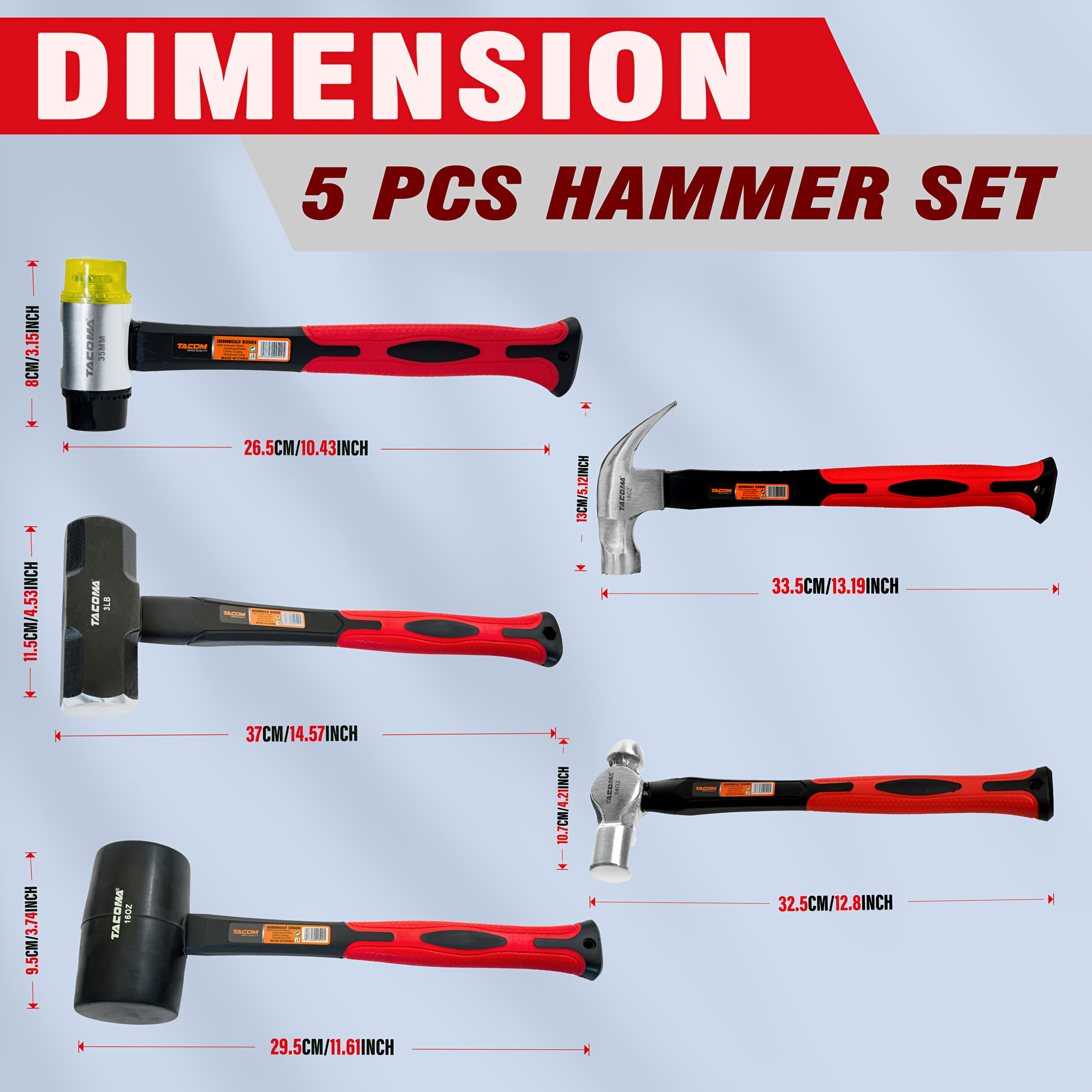 Reliable Brand: This 5-piece hammer collection offers multiple options for completing various tasks. The robust attachment of the hammerhead guarantees its longevity and durability even after extensive use. Don’t hesitate to reach out if you have inquiries regarding the TACOMA 5 PCS hammer set. We will respond to your questions within a day.