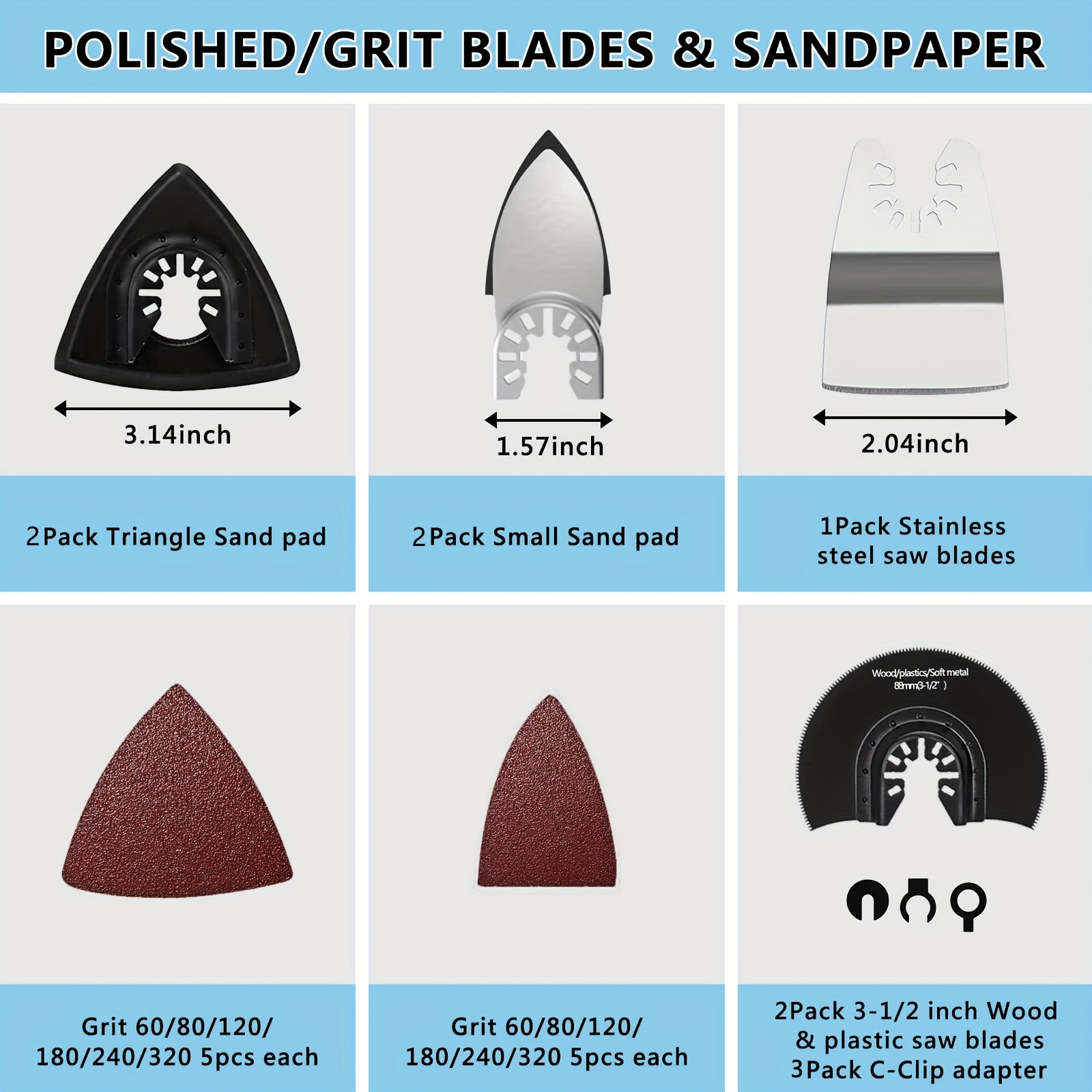 The sets of blades for multi-tools are commonly utilized for cutting various materials such as wood, plastic, metal, pipes, PVC, nails, wallpaper, plasterboard, and for DIY projects and home decor. The accessory kits for power oscillating tools can fulfill your requirements for cutting, grinding, polishing, and scraping.